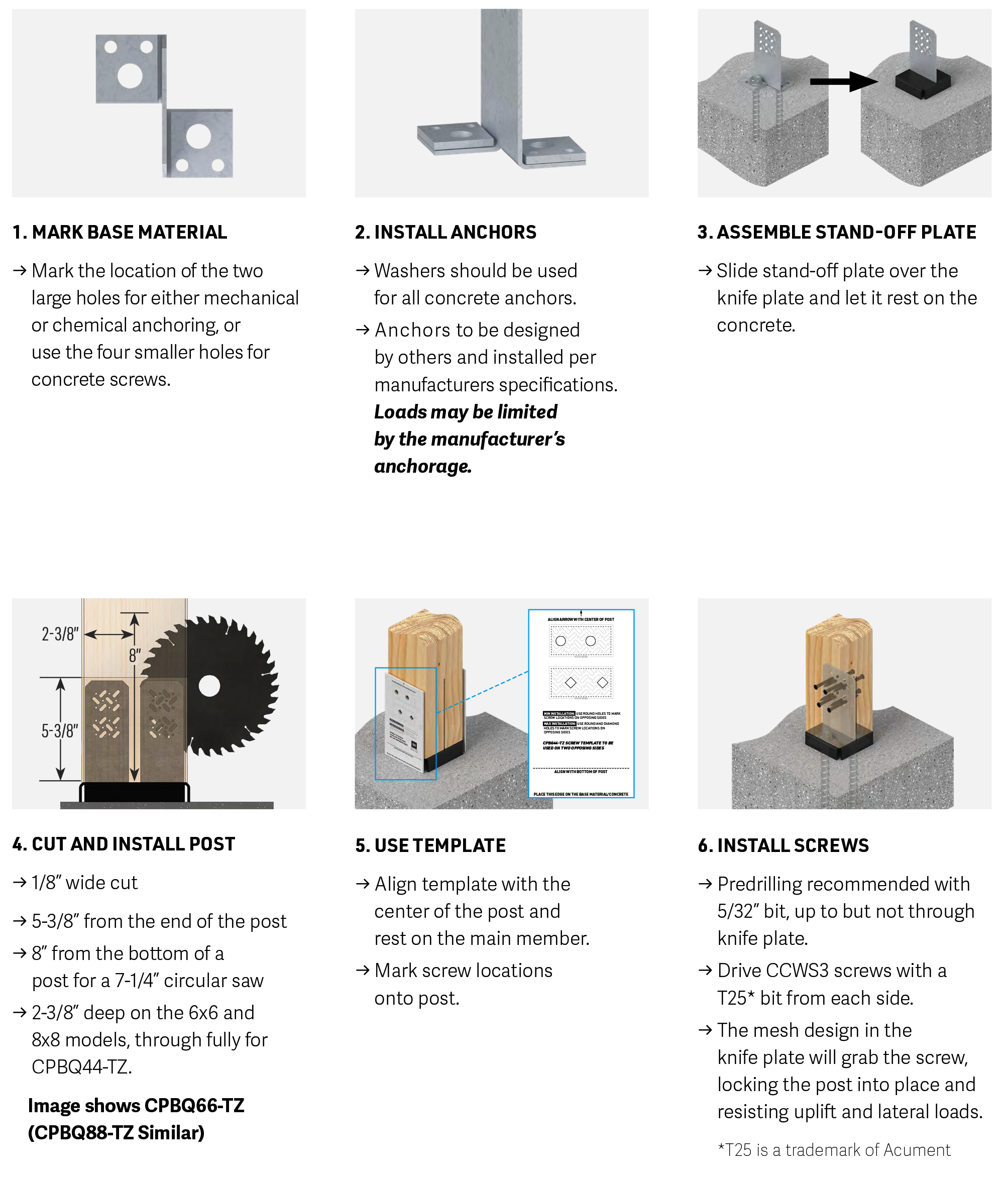 CPBQ post anchors discreetly secure wood posts to concrete footings allowing the beauty of the wood to shine through in a true architectural design. The innovative mesh design simplifies installation by allowing screws to be installed in a larger target area. Precise drilling for pins and bolts is not needed, making installation much easier. These post anchors provide protection against moisture damage by featuring a powder-coated 1-inch stand-off plate that elevates untreated wood posts above concrete surfaces, as mandated by building codes.